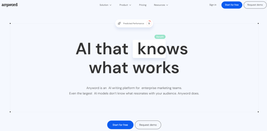 Anyword is an AI copywriting tool that specializes in creating optimized marketing copy. It helps generate compelling and engaging content for various channels, including ads, emails, and landing pages. Anyword stands out with its ability to predict performance scores for different versions of your copy, helping you choose the best option for your campaigns..