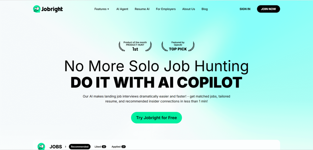 Jobright acts as an AI-powered job search companion that provides smart job recommendations, role matching, and resume tips.