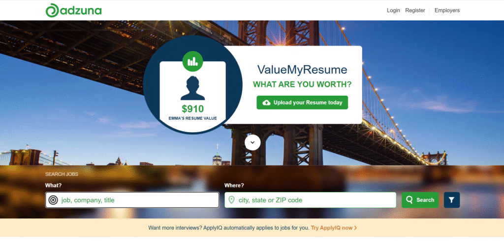 Adzuna provides insights on salary benchmarks and job market data too, so you can apply smartly.