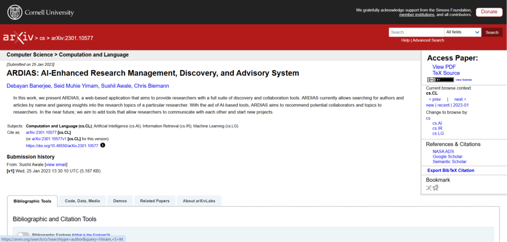 ARDIAS (AI Research Discovery and Analysis System) is an intelligent research management tool that uses AI to identify potential collaborators, related topics, and unexplored subfields.