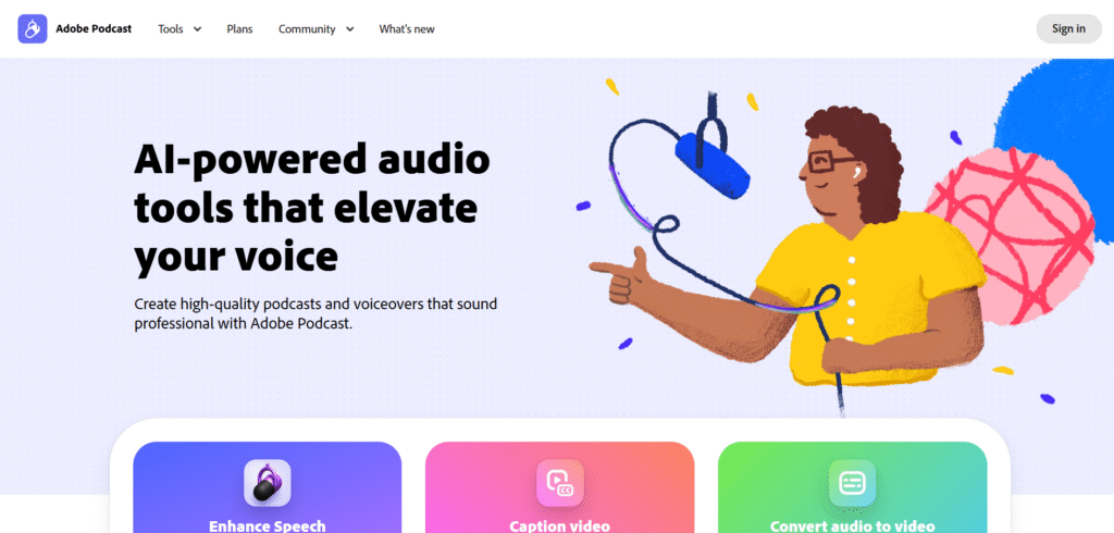 Adobe Podcast (formerly Project Shasta) uses cutting-edge AI to make professional-grade podcasting accessible to everyone. It automatically enhances voice clarity, removes background noise, and levels volume with studio-like precision — even from basic laptop microphones. Its “Enhance Speech” feature can make poor recordings sound as if they were captured in a soundproof studio.