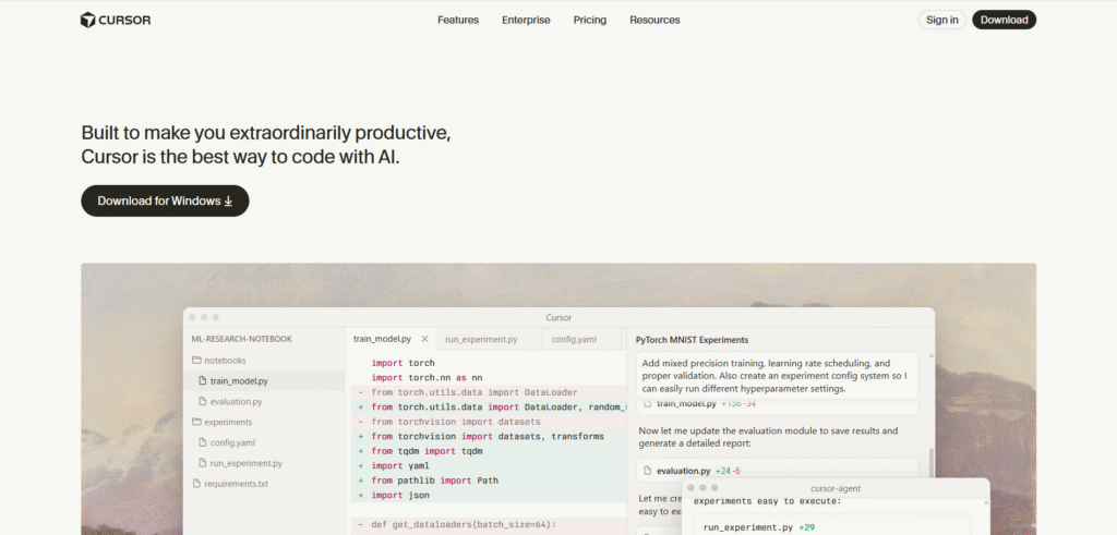 Cursor is a next-generation AI-first code editor built on top of VS Code. It goes beyond autocomplete — allowing you to talk to your codebase using natural language. Cursor indexes your entire project, understands context, and can refactor code, generate functions, write documentation, and debug errors with chat-like interactions.