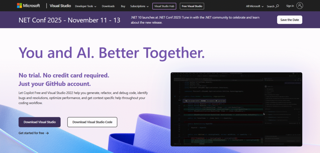 IntelliCode, Microsoft’s built-in AI assistant for Visual Studio, enhances standard IntelliSense with machine learning. It analyzes thousands of open-source projects to suggest context-relevant completions, code formatting, and style corrections. IntelliCode also predicts parameter names and offers team-level learning — training models on your repository to recommend consistent coding patterns.