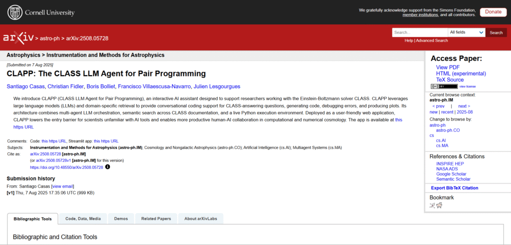 CLAPP (CLASS LLM Agent for Pair Programming) is an academic and domain-specific AI assistant designed for scientific coding and cosmology research using the CLASS library. It helps researchers write, debug, and visualize scientific simulations, providing inline documentation and auto-plotting capabilities. CLAPP illustrates how AI tools are evolving into specialized, discipline-focused assistants.