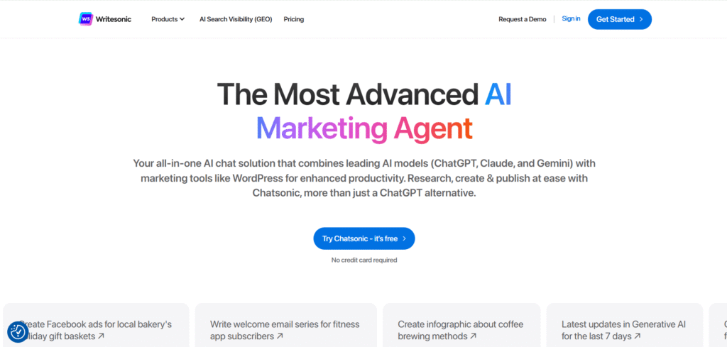 Writesonic blends copywriting + SEO + creativity into one tool. It can write long-form articles, landing pages, and ad copy optimized for search engines. Its integrated chatbot, Chatsonic, helps with real-time conversational copy creation.