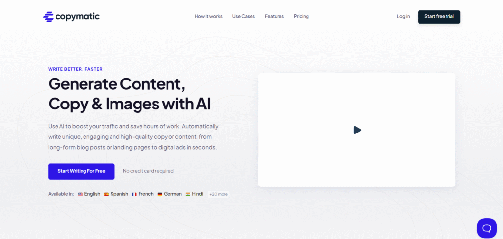 Copymatic is an all-in-one copywriting and content tool. It creates high-converting copy for blogs, ads, and landing pages while offering keyword optimization. It also supports translation into 20+ languages.