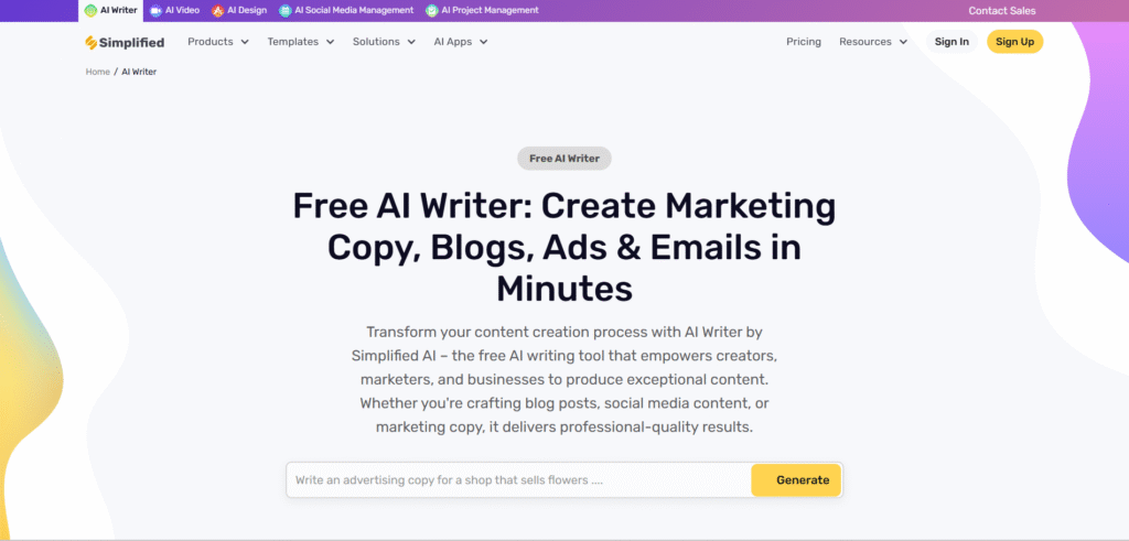 Simplified offers a complete content creation suite — design, video, and writing — powered by AI. Its copywriting tool helps you create everything from blogs to marketing slogans within a unified workspace.