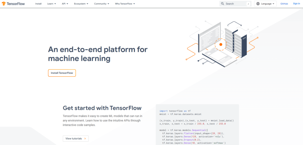 Features: TensorFlow, developed by Google, is an open-source machine learning framework. It is known for its flexibility and comprehensive libraries, which facilitate complex computations and deep learning models.