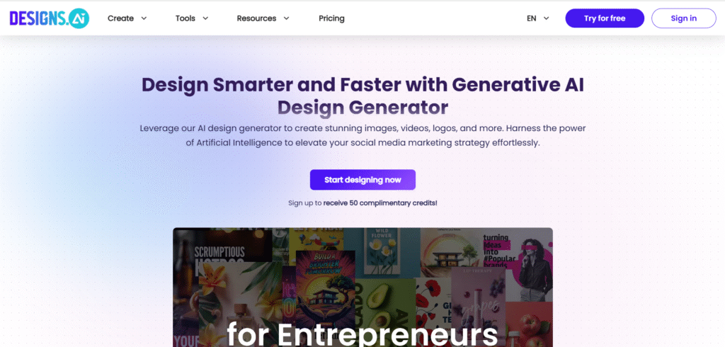 Designs.ai is an AI-powered creative suite that goes beyond images. It can generate logos, brand kits, videos, voiceovers, and banners — making it perfect for small businesses or agencies managing multiple brand assets.