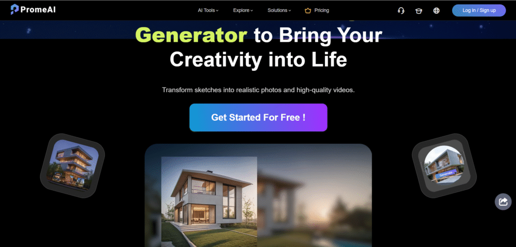 PromeAI combines image generation, sketch rendering, and photo editing into a single workspace. You can upload sketches, add prompts, and PromeAI turns them into polished visuals — ideal for architectural designs, fashion concepts, and digital art.