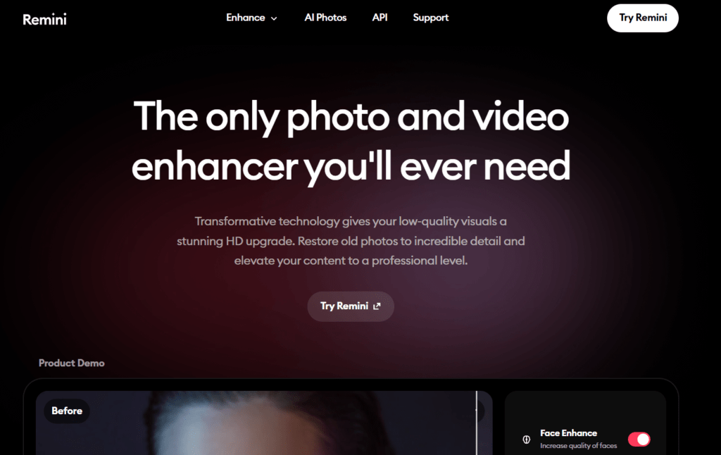 Remini | Photo enhancement, Restoration | Effective, Real-time processing | Limited free version, Internet required |