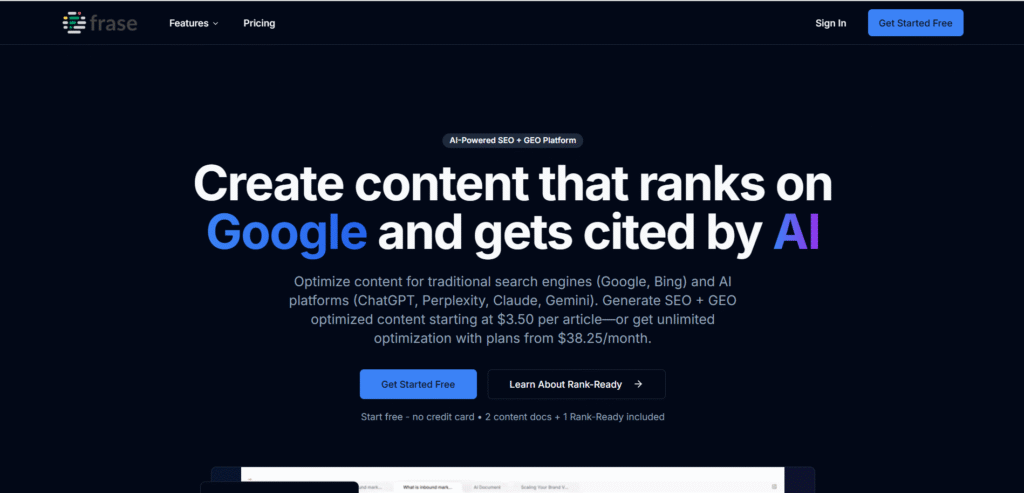 | Frase.io | Research + writing | Content teams | AI briefs, SERP analysis | frase.io |