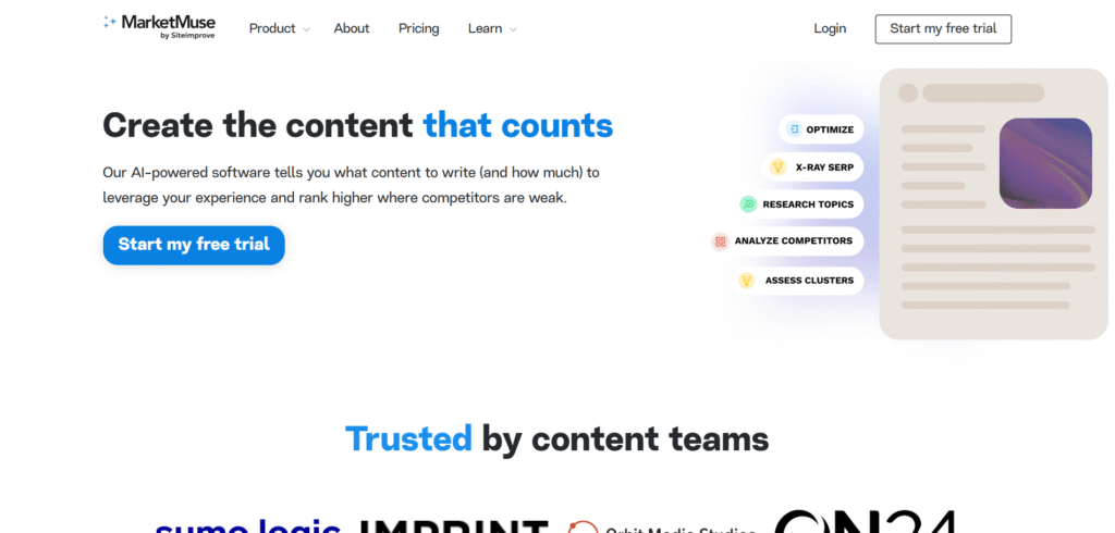 | MarketMuse | Topic authority builder | Large publishers | Content mapping, gap analysis | marketmuse.com |