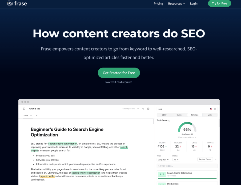 Features: Frase combines AI and NLP to create content briefs, optimize existing content, and improve overall content performance. It provides detailed insights and recommendations.