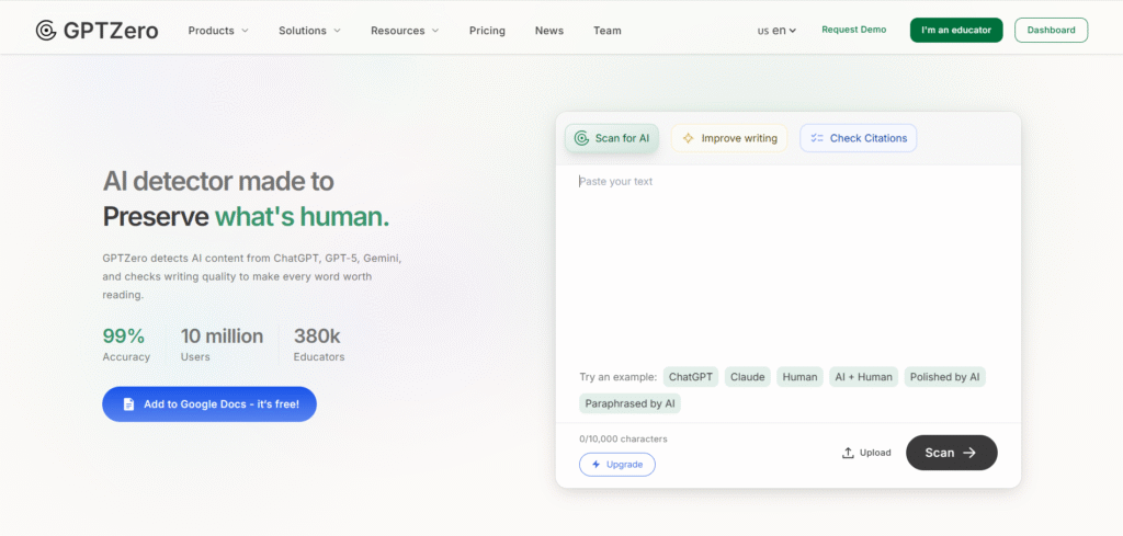 GPTZero is one of the earliest and most popular AI detection tools, built specifically to identify ChatGPT and other AI-written content. It analyzes perplexity (text predictability) and burstiness (variation in sentence structure) to determine whether text is machine-generated. The platform provides a detailed report highlighting suspicious sections and is widely used by schools, universities, and journalists for authenticity checks.
