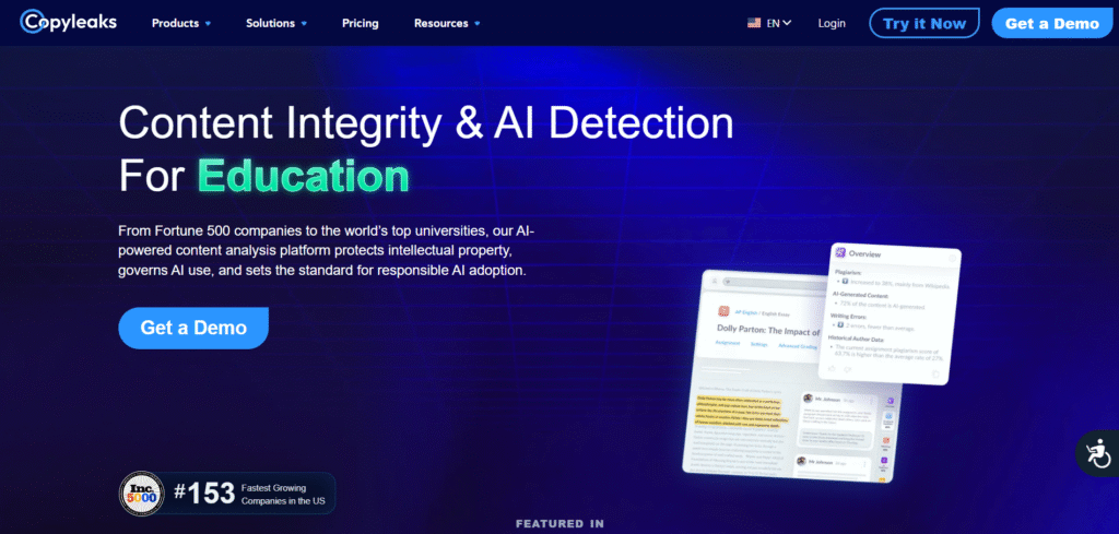 - Copyleaks – Multilingual AI detector with over 99% claimed accuracy, identifying content from GPT, Bard, and Claude models.