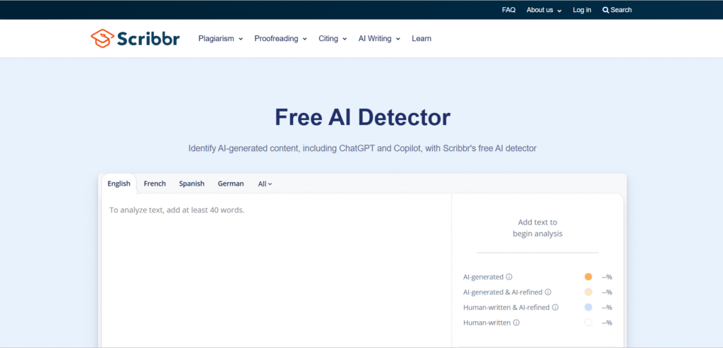 Scribbr, trusted by academic institutions, offers a precise AI text detector that checks essays, theses, and research papers for signs of AI involvement. It detects full or partial AI authorship and offers paragraph-level analysis for detailed feedback. Combined with plagiarism detection, it’s particularly popular in universities and research environments.