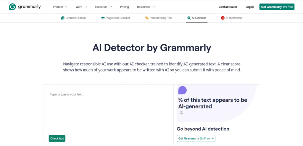 - Grammarly AI Detector – Built into Grammarly to flag AI-generated sections while enhancing writing quality and tone.