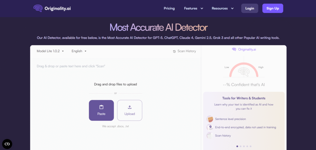 Originality.AI is a professional-grade AI and plagiarism detection platform used by publishers, bloggers, and SEO agencies. It scans for both AI-generated and copied content simultaneously. Its detailed reports show content origin, sentence-level flags, and detection confidence scores. The platform also provides team collaboration features, making it ideal for editorial workflows.