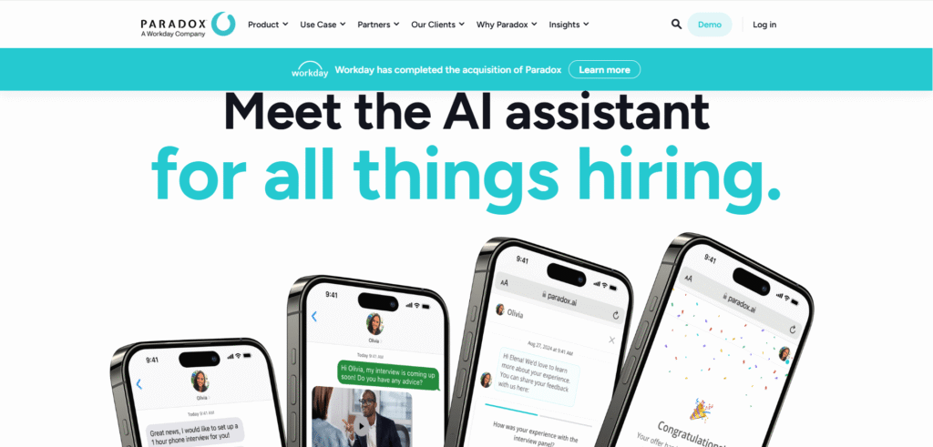 Paradox, known for its AI assistant Olivia, automates time-consuming recruitment tasks such as screening resumes, scheduling interviews, and answering candidate queries. Olivia interacts conversationally through chat or text, providing real-time engagement while freeing up recruiters for strategic work. The platform integrates easily with major ATS systems like Workday, Greenhouse, and Lever.