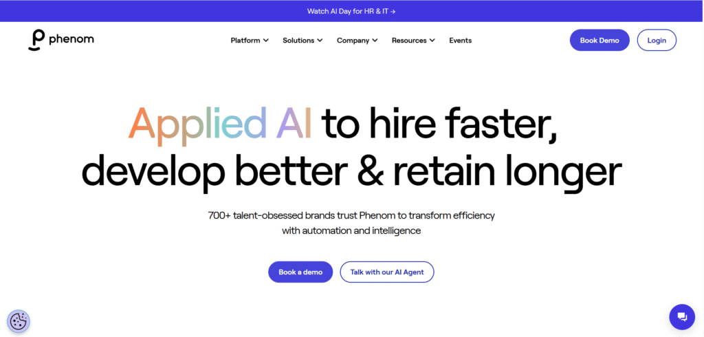 Phenom People is an AI-powered talent experience platform that personalizes every step of the candidate and employee journey. Its AI chatbot engages job seekers, while analytics optimize job recommendations, content, and internal mobility. Phenom also uses predictive insights to enhance retention and match internal employees with growth opportunities.
