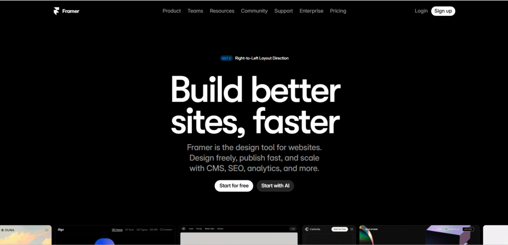 Framer AI allows you to build full websites from text prompts. You describe your website’s purpose, and Framer instantly designs responsive layouts, typography, and visuals — editable in real time. It’s great for designers who want AI to create a base, then manually refine for pixel-perfect control.