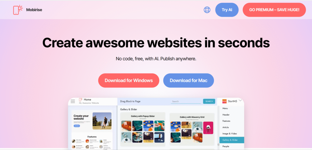 Mobirise AI is a no-code offline web design app that adds AI page generation. It runs locally (great for privacy-conscious users) and can automatically generate landing pages or multi-page layouts. You can then customize content blocks visually without any code.