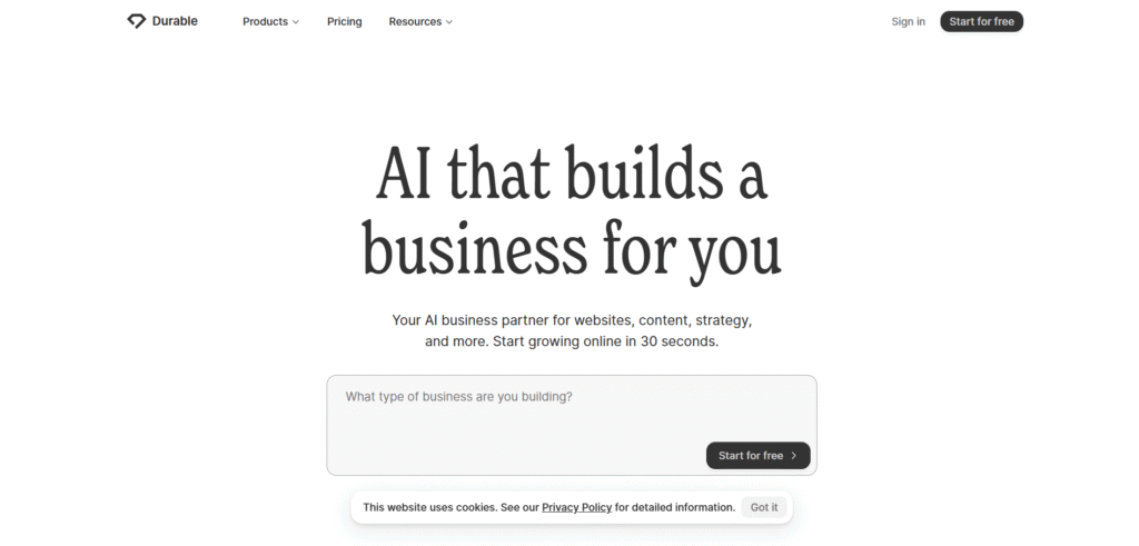 Durable AI is a true text-to-website builder — you describe your business in a few sentences, and within 30 seconds, it generates a full live website with text, photos, and CTAs. It even adds basic branding, analytics, and SEO setup automatically.