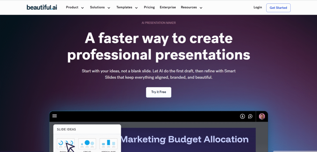 Beautiful.ai is a smart presentation design platform that automates slide formatting, layouts, and alignment.