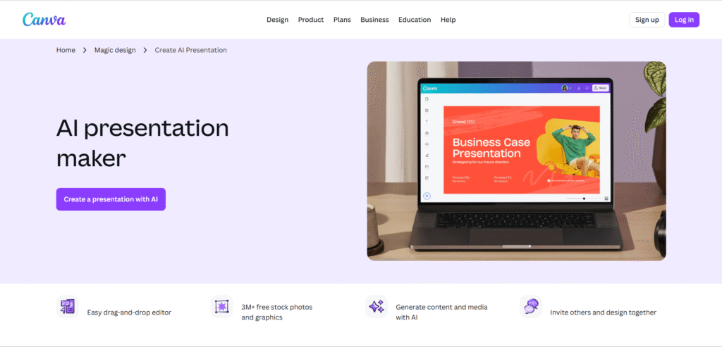 You can input your idea or topic, and Canva auto-generates a presentation with text, graphics, and design elements — all customizable within its drag-and-drop interface.