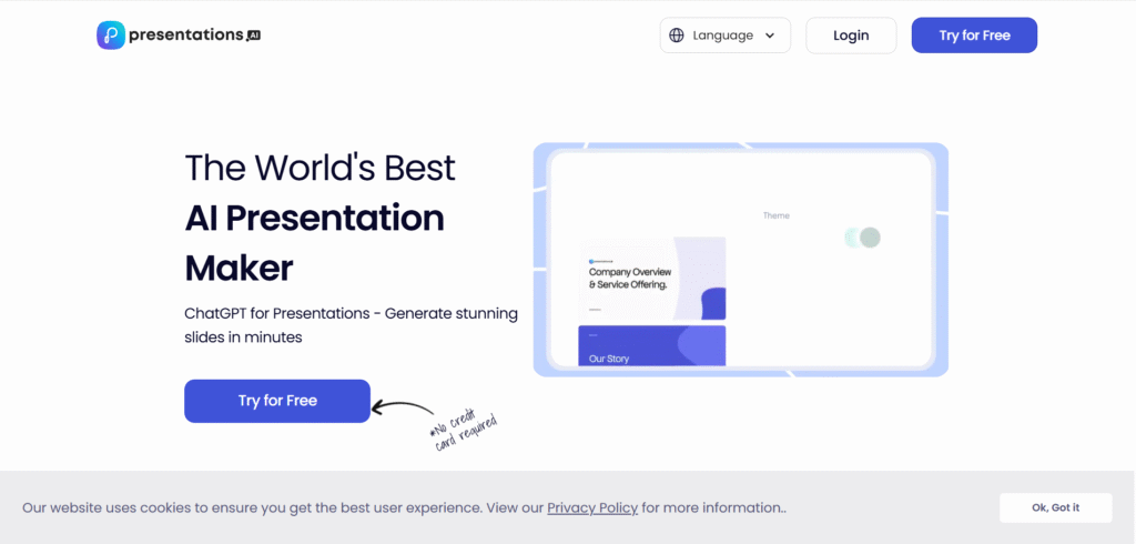 Presentations.AI is an AI-first presentation builder that transforms your text or topic into full-fledged decks with charts, data, and visuals.