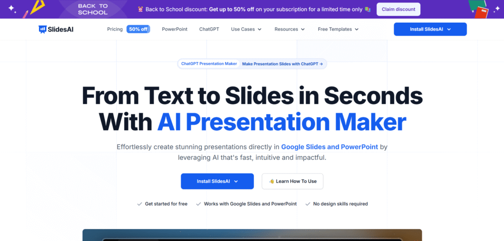 SlidesAI is a Google Slides add-on that instantly converts plain text or bullet points into ready-to-present slides.