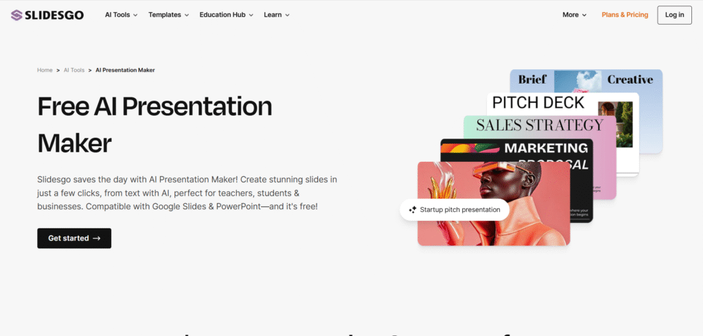 Slidesgo’s AI Presentation Maker is designed to help users generate creative, themed slide decks for both Google Slides and PowerPoint.