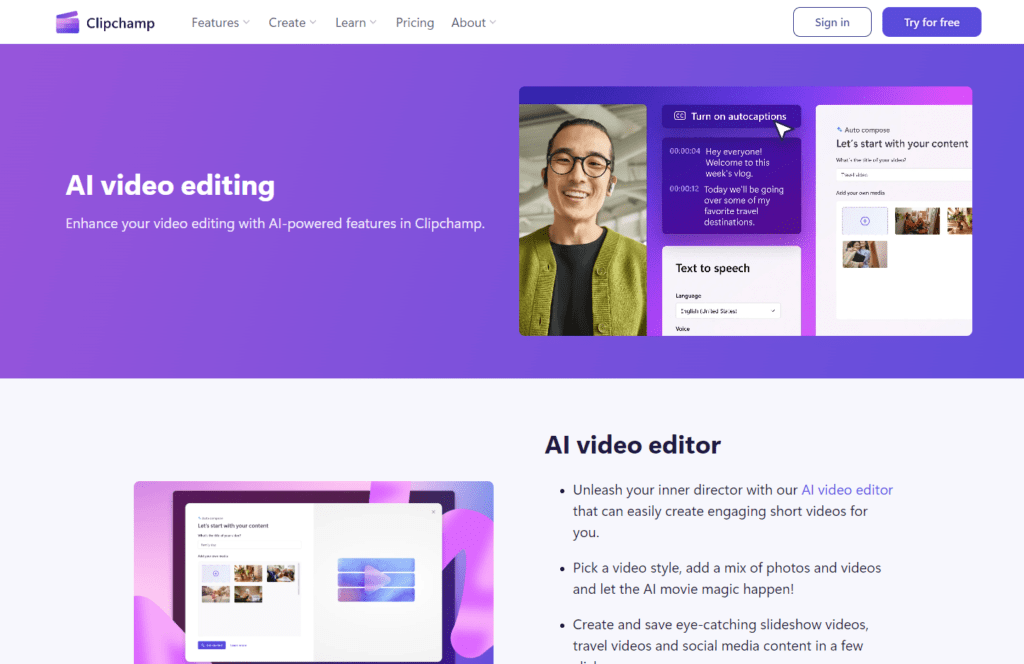 Clipchamp is an AI-powered video editing platform that offers a range of tools for creating and editing videos. It’s popular among content creators, educators, and marketers.